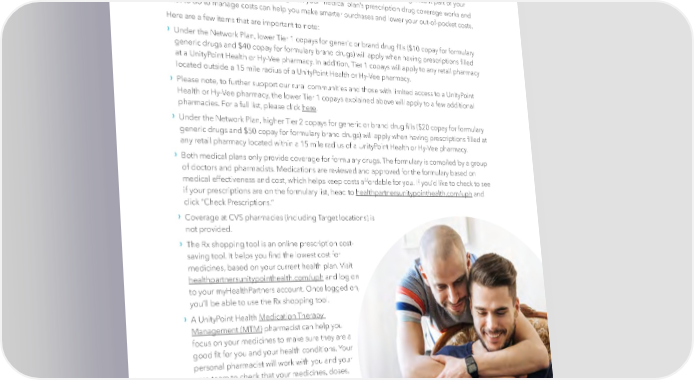 Health Insurance, continued About Your Medical Plan’s Prescription Drug Coverage If you take any medications regularly, prescription drug costs can add up to a signi昀椀cant part of your overall health care expenses. Knowing how your medical plan’s prescription drug coverage works and what to do to manage costs can help you make smarter purchases and lower your out-of-pocket costs. Here are a few items that are important to note: › Under the Network Plan, lower Tier 1 copays for generic or brand drug 昀椀lls ($10 copay for formulary generic drugs and $40 copay for formulary brand drugs) will apply when having prescriptions 昀椀lled at a UnityPoint Health or Hy-Vee pharmacy. In addition, Tier 1 copays will apply to any retail pharmacy located outside a 15 mile radius of a UnityPoint Health or Hy-Vee pharmacy. › Please note, to further support our rural communities and those with limited access to a UnityPoint Health or Hy-Vee pharmacy, the lower Tier 1 copays explained above will apply to a few additional pharmacies. For a full list, please click here. › Under the Network Plan, higher Tier 2 copays for generic or brand drug 昀椀lls ($20 copay for formulary generic drugs and $50 copay for formulary brand drugs) will apply when having prescriptions 昀椀lled at any retail pharmacy located within a 15 mile radius of a UnityPoint Health or Hy-Vee pharmacy. › Both medical plans only provide coverage for formulary drugs. The formulary is compiled by a group of doctors and pharmacists. Medications are reviewed and approved for the formulary based on medical effectiveness and cost, which helps keep costs affordable for you. If you’d like to check to see if your prescriptions are on the formulary list, head to healthpartnersunitypointhealth.com/uph and click “Check Prescriptions.” › Coverage at CVS pharmacies (including Target locations) is not provided. › The Rx shopping tool is an online prescription cost- saving tool. It helps you 昀椀nd the lowest cost for medicines, based on your current health plan. Visit healthpartnersunitypointhealth.com/uph and log on to your myHealthPartners account. Once logged on, you’ll be able to use the Rx shopping tool. › A UnityPoint Health Medication Therapy Management (MTM) pharmacist can help you focus on your medicines to make sure they are a good 昀椀t for you and your health conditions. Your personal pharmacist will work with you and your care team to check that your medicines, doses, and schedules meet your needs. Your pharmacist will also make sure that your drugs work well together and aren’t causing side effects. Visits can often be provided by phone or video conference, making them easier to 昀椀t into your schedule. Working with a pharmacist on a regular basis might also save you money on your medicine copays. | 11 |