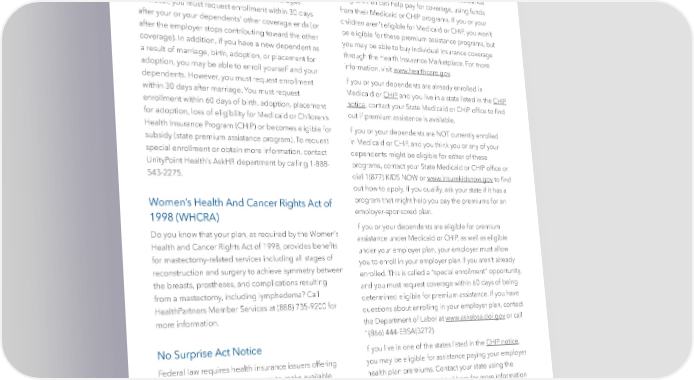 HIPAA Notice of Special Enrollment Rights Premium Assistance Under Medicaid and If you are declining enrollment for yourself or your The Children’s Health Insurance Program dependents (including your spouse) because of other (CHIP) health insurance or group health plan coverage, you may If you or your children are eligible for Medicaid or be able to enroll yourself and your dependents in this CHIP and you’re eligible for health coverage from your plan if you or your dependents lose eligibility for that employer, your state may have a premium assistance other coverage (or if the employer stops contributing program that can help pay for coverage, using funds toward your or your dependents’ other coverage). from their Medicaid or CHIP programs. If you or your However, you must request enrollment within 30 days children aren’t eligible for Medicaid or CHIP, you won’t after your or your dependents’ other coverage ends (or be eligible for these premium assistance programs, but after the employer stops contributing toward the other you may be able to buy individual insurance coverage coverage). In addition, if you have a new dependent as through the Health Insurance Marketplace. For more a result of marriage, birth, adoption, or placement for information, visit www.healthcare.gov. adoption, you may be able to enroll yourself and your dependents. However, you must request enrollment If you or your dependents are already enrolled in within 30 days after marriage. You must request Medicaid or CHIP and you live in a state listed in the CHIP enrollment within 60 days of birth, adoption, placement notice, contact your State Medicaid or CHIP of昀椀ce to 昀椀nd for adoption, loss of eligibility for Medicaid or Children’s out if premium assistance is available. Health Insurance Program (CHIP) or becomes eligible for If you or your dependents are NOT currently enrolled subsidy (state premium assistance program). To request in Medicaid or CHIP, and you think you or any of your special enrollment or obtain more information, contact dependents might be eligible for either of these UnityPoint Health’s AskHR department by calling 1-888- programs, contact your State Medicaid or CHIP of昀椀ce or 543-2275. dial 1(877) KIDS NOW or www.insurekidsnow.gov to 昀椀nd out how to apply. If you qualify, ask your state if it has a Women’s Health And Cancer Rights Act of program that might help you pay the premiums for an 1998 (WHCRA) employer-sponsored plan. If you or your dependents are eligible for premium Do you know that your plan, as required by the Women’s assistance under Medicaid or CHIP, as well as eligible Health and Cancer Rights Act of 1998, provides bene昀椀ts under your employer plan, your employer must allow for mastectomy-related services including all stages of you to enroll in your employer plan if you aren’t already reconstruction and surgery to achieve symmetry between enrolled. This is called a “special enrollment” opportunity, the breasts, prostheses, and complications resulting and you must request coverage within 60 days of being from a mastectomy, including lymphedema? Call determined eligible for premium assistance. If you have HealthPartners Member Services at (888) 735-9200 for questions about enrolling in your employer plan, contact more information. the Department of Labor at www.askebsa.dol.gov or call 1(866) 444-EBSA(3272). No Surprise Act Notice If you live in one of the states listed in the CHIP notice, Federal law requires health insurance issuers offering you may be eligible for assistance paying your employer group health insurance coverage to make available health plan premiums. Contact your state using the a notice to team members informing them of federal contact information provided here for more information restrictions on balance billing and the requirements on eligibility. under Code 9816, ERISA section 716, and PHS Act second 2799A-1. The No Surprise Act Notice also lets you know how you may contact appropriate state or federal agencies if a provider or facility has violated the restrictions against balance billing. | 49 |