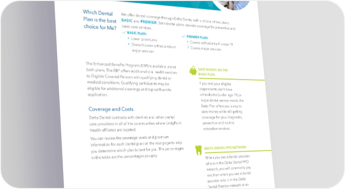 Dental Insurance Which Dental We offer dental coverage through Delta Dental with a choice of two plans: Plan is the best BASIC and PREMIER. Both dental plans provide coverage for preventive and choice for Me? basic care services. BASIC PLAN: PREMIER PLAN: › Lower premiums › C overs orthodontia if under 19 › Doesn’t cover or thodontia or › C overs major services major services The Enhanced Bene昀椀ts Program (EBP) is available under SAVE MONEY ON THE both plans. The EBP offers additional oral health services BASIC PLAN to Eligible Covered Persons with qualifying dental or medical conditions. Qualifying participants may be If you and your eligible eligible for additional cleanings and topical 昀氀uoride dependents don’t have application. orthodontia (under age 19) or major dental service needs, the Coverage and Costs Basic Plan offers you a way to save money while still getting Delta Dental contracts with dentists and other dental coverage for your diagnostic, care providers in all of the communities where UnityPoint preventive and routine Health af昀椀liates are located. restorative services. You can review the coverage levels and premium information for each dental plan on the next page to help you determine which plan is best for you. The percentages DELTA DENTAL PPO NETWORK in the table are the percentages you pay. When you see a dental provider who is in the Delta Dental PPO network, you will commonly pay less than when you see a dental provider who is in the Delta Dental Premier network or an out-of-network provider. | 15 |