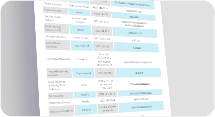 Vendor Contact List PLAN CONTACT PHONE WEBSITE Health Insurance/ HealthPartners (888) 735-9200 healthpartnersunitypointhealth.com/uph FSA Dental Insurance Delta Dental of Iowa (800) 544-0718 deltadentalia.com Vision Insurance Avesis (855) 214-6777 avesis.com Applied Health Applied Health (855) 581-9910 onpointforhealthuph.personal Analytics Analytics healthportal. net/login Health Savings Fidelity (800) 544-3716 netbene昀椀ts.com Account (HSA) Accident Insurance Voya Financial (877) 236-7564 voya.com Critical Illness Voya Financial (877) 236-7564 voya.com Insurance Life Inquires: Life/AD&D/ Disability Prudential (800) 524-0542 EOI Inquires: www.prudential.com/mybene昀椀ts (888) 257-0412 Hospital Indemnity Voya Financial (877) 236-7564 voya.com Insurance Legal Insurance (800) 247-4184 & Identity Theft ARAG (access code ARAGLegalCenter.com Protection 18191uph) Pet Insurance MetLife (800) GET-MET8 metlife.com/getpetquote Retirement Savings Fidelity (800) 343-0860 netbene昀椀ts.com Education Assistance EdAssist live chat available unitypoint.edassist.com on website UnityPoint Health IT UnityPoint Health (800) 681-2060 N/A Service Center | 47 |