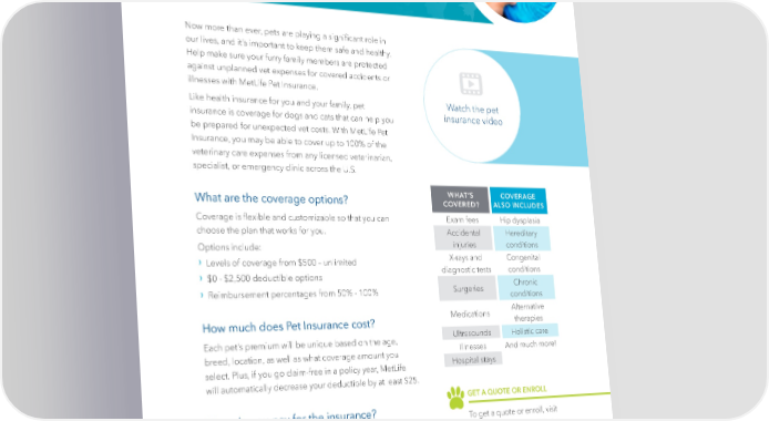 Pet Insurance Now more than ever, pets are playing a signi昀椀cant role in our lives, and it’s important to keep them safe and healthy. Help make sure your furry family members are protected against unplanned vet expenses for covered accidents or illnesses with MetLife Pet Insurance. Like health insurance for you and your family, pet Watch the pet insurance is coverage for dogs and cats that can help you insurance video be prepared for unexpected vet costs. With MetLife Pet Insurance, you may be able to cover up to 100% of the veterinary care expenses from any licensed veterinarian, specialist, or emergency clinic across the U.S. What are the coverage options? WHAT’S COVERAGE COVERED? ALSO INCLUDES Coverage is 昀氀exible and customizable so that you can Exam fees Hip dysplasia choose the plan that works for you. Accidental Hereditary Options include: injuries conditions › X-rays and Congenital L evels of coverage from $500 – unlimited › diagnostic tests conditions $0 - $2,500 deductible options Chronic › Surgeries Reimbursement percentages from 50% - 100% conditions Medications Alternative How much does Pet Insurance cost? therapies Each pet’s premium will be unique based on the age, Ultrasounds Holistic care breed, location, as well as what coverage amount you Illnesses And much more! select. Plus, if you go claim-free in a policy year, MetLife Hospital stays will automatically decrease your deductible by at least $25. GET A QUOTE OR ENROLL How do you pay for the insurance? To get a quote or enroll, visit You can set up an automatic payment from your bank or metlife.com/getpetquote or credit card with MetLife. call (800) GET-MET8. | 33 |