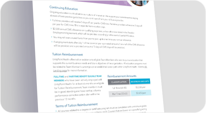 Education Assistance Bene昀椀ts Continuing Education Ongoing education is critical within our culture of innovation. We support your commitment to staying abreast of best-practice guidelines as you continue to hone your skills as a provider. › Full-time providers will receive 5 days off per year for CME time. Part-time providers will receive 3 days off per year for CME time. This is separate from vacation days. › $2,500 annual CME allowance on qualifying expenses, unless otherwise stated in the Provider Employment Agreement, which will be prorated accordingly in the event of partial FTE status. › You may roll over unused funds from year to year, up to one times your annual allowance. › If employment starts after July 1 of the calendar year a prorated amount of one-half of the CME allowance will be provided and a prorated amount of 3 days of CME days will be provided. Tuition Reimbursement UnityPoint Health offers tuition assistance to eligible Team Members who seek to pursue education that supports the current business needs and future objectives of the organization. All education programs must be related to Team Member’s current job or an established career path within UnityPoint Health. Visit the HR Landing page for more information. FULL-TIME and PART-TIME BENEFIT ELIGIBLE TEAM Reimbursement Amounts MEMBERS who have been actively employed with UnityPoint Health for at least six months are eligible CLASSIFICATION MAXIMUM AMOUNTS for Tuition Reimbursement. Team members must Full Time (64-80) $5,250/year be in good standing and have not had a formal performance corrective action plan within the Part Time (32-63) $2,625/year previous 12 months. Terms of Tuition Reimbursement › All courses related to a degree or certi昀椀cate program must be completed with a minimum grade equivalent of C or better and award college credit. Courses that are based on a pass/fail grading system must be completed with a passing grade. Courses in which a Team Member receives an incomplete, withdrawal, or equivalent grade are ineligible. › Eligible expenses include tuition, required textbooks, and mandatory course-related fees such as registration or admissions fees, lab fees, technology fees, library cards, and graduation fees. › Ineligible expenses include, but are not limited to, meals, lodging, transportation and tools or supplies (other than textbooks) that can be kept after completing the course of instruction › Educational programs not covered include, but are not limited to, individual courses for sports, recreation or hobbies, unless part of a degree program and seminars, conferences and workshops. | 41 |