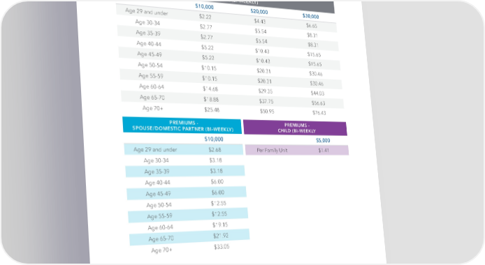 Critical Illness Insurance: Bi-Weekly Premiums PREMIUMS - EMPLOYEE (BI-WEEKLY) $10,000 $20,000 $30,000 Age 29 and under $2.22 $4.43 $6.65 Age 30-34 $2.77 $5.54 $8.31 Age 35-39 $2.77 $5.54 $8.31 Age 40-44 $5.22 $10.43 $15.65 Age 45-49 $5.22 $10.43 $15.65 Age 50-54 $10.15 $20.31 $30.46 Age 55-59 $10.15 $20.31 $30.46 Age 60-64 $14.68 $29.35 $44.03 Age 65-70 $18.88 $37.75 $56.63 Age 70+ $25.48 $50.95 $76.43 PREMIUMS - PREMIUMS - SPOUSE/DOMESTIC PARTNER (BI-WEEKLY) CHILD (BI-WEEKLY $10,000 $5,000 Age 29 and under $2.68 Per Family Unit $1.41 Age 30-34 $3.18 Age 35-39 $3.18 Age 40-44 $6.00 Age 45-49 $6.00 Age 50-54 $12.55 Age 55-59 $12.55 Age 60-64 $19.15 Age 65-70 $21.92 Age 70+ $33.05 | 27 |