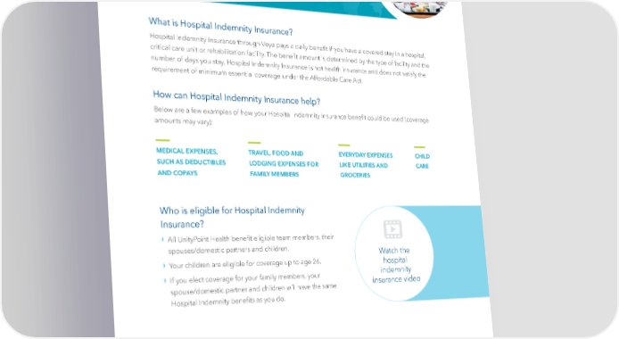 Hospital Indemnity Insurance What is Hospital Indemnity Insurance? Hospital Indemnity Insurance through Voya pays a daily bene昀椀t if you have a covered stay in a hospital, critical care unit or rehabilitation facility. The bene昀椀t amount is determined by the type of facility and the number of days you stay. Hospital Indemnity Insurance is not health insurance and does not satisfy the requirement of minimum essential coverage under the Affordable Care Act. How can Hospital Indemnity Insurance help? Below are a few examples of how your Hospital Indemnity Insurance bene昀椀t could be used (coverage amounts may vary): MEDICAL EXPENSES, TRAVEL, FOOD AND EVERYDAY EXPENSES CHILD SUCH AS DEDUCTIBLES LODGING EXPENSES FOR LIKE UTILITIES AND CARE AND COPAYS FAMILY MEMBERS GROCERIES Who is eligible for Hospital Indemnity Insurance? › All UnityP oint Health bene昀椀t eligible team members, their spouses/domestic partners and children. Watch the › Y our children are eligible for coverage up to age 26. hospital › indemnity If you elect coverage for your family members, your insurance video spouse/domestic partner and children will have the same Hospital Indemnity bene昀椀ts as you do. | 29 |