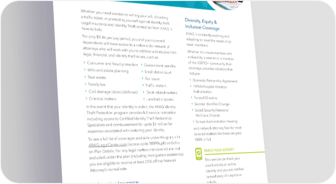 Legal Insurance & Identity Theft Protection Whether you need assistance writing your will, disputing Diversity, Equity & a traf昀椀c ticket, or protecting yourself against identity theft, Inclusion Coverage Legal Insurance and Identity Theft protection from ARAG is here to help. ARAG is constantly evolving and adapting to meet the needs of all For only $9.46 per pay period, you and your covered team members. dependents will have access to a nationwide network of attorneys who will work with you to address and resolve life’s Whether it’s a team member with legal, 昀椀nancial, and identity theft issues, such as: a disability, a veteran or a member › › of the LGBTQ+ community, their Consumer and fraud protection Government bene昀椀ts coverage provides solutions that › › Wills and estate planning Small claims court include: › › › Real estate Tax issues Domestic Partnership Agreement › › › Family law Traf昀椀c matters HIPAA/Hospital Visitation › › Authorization Civil damage claims (defense) Debt-related matters › › › Funeral Directive Criminal matters Landlord disputes › In the event that your identity is stolen, the ARAG Identity Gender Identi昀椀er Change › Theft Protection program provides full-service restoration Social Security/Veterans/ including access to Certi昀椀ed Identity Theft Restoration Medicare Dispute › Specialists and reimbursement for up to $1 million for School Administration Hearing expenses associated with restoring your identity. and, network attorney fees for most To see a full list of coverages available under this plan, visit covered matters like these are paid ARAGLegalCenter.com (access code 18191uph) and click 100% in full. on Plan Details. For any legal matters not covered and not excluded under the plan (including immigration assistance), TRACK YOUR ACTIVITY you are eligible to receive at least 25% off the Network This service can track your Attorney’s normal rate. credit activity or online identity and you are noti昀椀ed Malpractice Insurance immediately of suspicious Your malpractice insurance is provided by UnityPoint activity. Health at no cost to you. Please reference your Provider Employment Agreement for more information. Questions should be directed to your af昀椀liate risk management/ compliance department. | 32 |