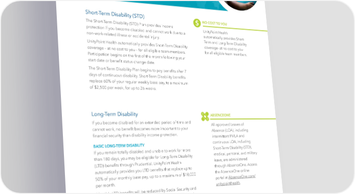 Short-Term Disability & Long-Term Disability Short-Term Disability (STD) NO COST TO YOU The Short-Term Disability (STD) Plan provides income UnityPoint Health protection if you become disabled and cannot work due to a automatically provides Short- non-work-related illness or accidental injury. Term and Long-Term Disability UnityPoint Health automatically provides Short-Term Disability coverage- at no cost to you- coverage – at no cost to you – for all eligible team members. for all eligible team members. Participation begins on the 昀椀rst of the month following your start date or bene昀椀t status change date. The Short-Term Disability Plan begins to pay bene昀椀ts after 7 days of continuous disability. Short-Term Disability bene昀椀ts replace 60% of your regular weekly base pay, to a maximum of $2,500 per week, for up to 26 weeks. Long-Term Disability ABSENCEONE If you become disabled for an extended period of time and All approved Leaves of cannot work, no bene昀椀t becomes more important to your Absence (LOA), including 昀椀nancial security than disability income protection. intermittent FMLA and BASIC LONG-TERM DISABILITY continuous LOA, including If you remain totally disabled and unable to work for more Short-Term Disability (STD), than 180 days, you may be eligible for Long-Term Disability medical, personal, and military (LTD) bene昀椀ts through Prudential. UnityPoint Health leave, are administered automatically provides you LTD bene昀椀ts that replace up to through AbsenceOne. Access 50% of your monthly base pay, up to a maximum of $10,000 the AbsenceOne online per month. portal at AbsenceOne.com/ Monthly LTD bene昀椀ts will be reduced by Social Security and unitypointhealth. any other disability income you are eligible to receive, such as Workers’ Compensation. BUY-UP LONG-TERM DISABILITY You can purchase additional LTD coverage through Prudential that will increase your monthly bene昀椀t to 60% of your monthly pay. The cost of this additional coverage is available in Lawson during your enrollment. | 31 |