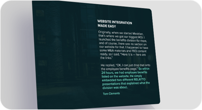 WEBSITE INTEGRATION MADE EASY Originally, when we started Meridian, that’s where we got our biggest ROI. I launched the benefits division for them, and of course, there was no section on our website for that. I happened to have some M&A materials and PEO content ready, so I said, “Here it is — here are the links.” He replied, “OK, I can just drop that onto the employee benefits page.” So within 24 hours, we had employee benefits listed on the website. He simply embedded two different RELAYTO presentations that explained what the division was about. Tom Clements