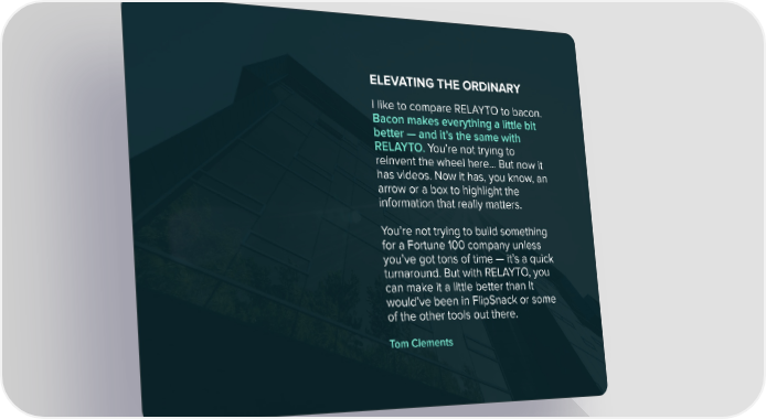 I like to compare RELAYTO to bacon. Bacon makes everything a little bit better — and it’s the same with RELAYTO. You’re not trying to reinvent the wheel here… But now it has videos. Now it has, you know, an arrow or a box to highlight the information that really matters. You’re not trying to build something for a Fortune 100 company unless you’ve got tons of time — it’s a quick turnaround. But with RELAYTO, you can make it a little better than it would’ve been in FlipSnack or some of the other tools out there. ELEVATING THE ORDINARY Tom Clements