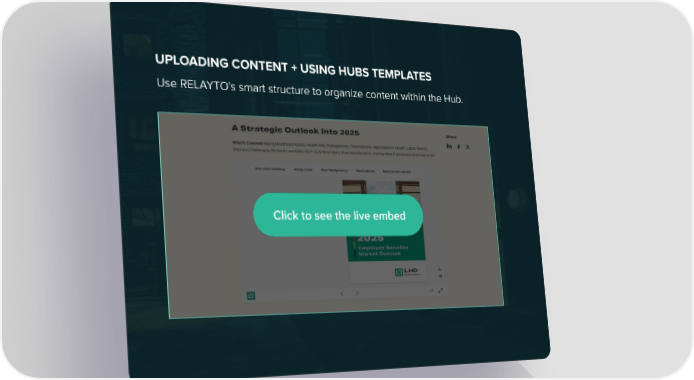 Click to see the live embed Use RELAYTO’s smart structure to organize content within the Hub. UPLOADING CONTENT + USING HUBS TEMPLATES