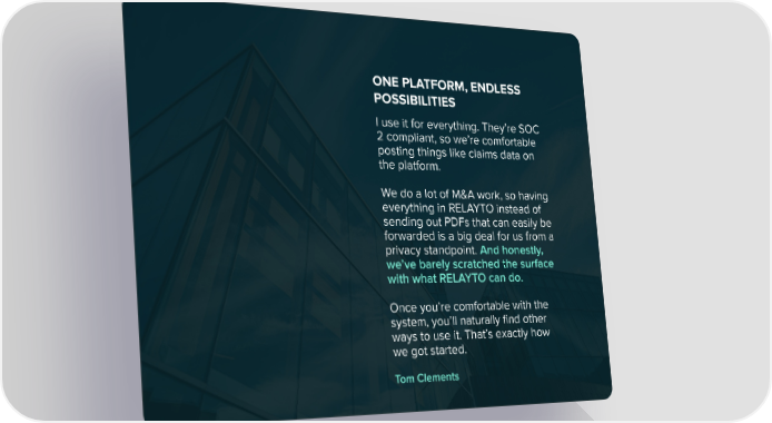 I use it for everything. They’re SOC 2 compliant, so we’re comfortable posting things like claims data on the platform. We do a lot of M&A work, so having everything in RELAYTO instead of sending out PDFs that can easily be forwarded is a big deal for us from a privacy standpoint. And honestly, we’ve barely scratched the surface with what RELAYTO can do. Once you’re comfortable with the system, you’ll naturally find other ways to use it. That’s exactly how we got started. ONE PLATFORM, ENDLESS POSSIBILITIES Tom Clements
