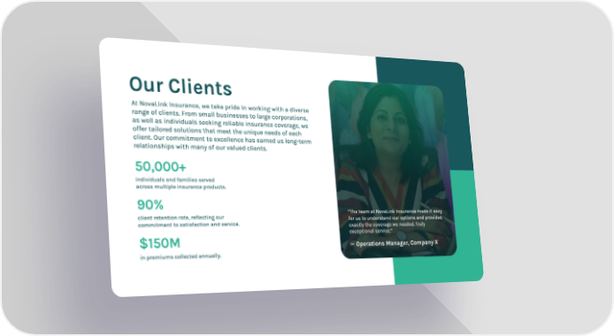 Our Clients “The team at NovaLink Insurance made it easy for us to understand our options and provided exactly the coverage we needed. Truly exceptional service.” — Operations Manager, Company X At NovaLink Insurance, we take pride in working with a diverse range of clients. From small businesses to large corporations, as well as individuals seeking reliable insurance coverage, we offer tailored solutions that meet the unique needs of each client. Our commitment to excellence has earned us long-term relationships with many of our valued clients. individuals and families served across multiple insurance products. 50,000+ client retention rate, reflecting our commitment to satisfaction and service. 90% in premiums collected annually. $150M
