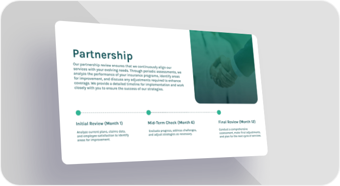 Partnership Our partnership review ensures that we continuously align our services with your evolving needs. Through periodic assessments, we analyze the performance of your insurance programs, identify areas for improvement, and discuss any adjustments required to enhance coverage. We provide a detailed timeline for implementation and work closely with you to ensure the success of our strategies. Initial Review (Month 1) Analyze current plans, claims data, and employee satisfaction to identify areas for improvement. Mid-Term Check (Month 6) Evaluate progress, address challenges, and adjust strategies as necessary. Final Review (Month 12) Conduct a comprehensive assessment, make final adjustments, and plan for the next cycle of services.