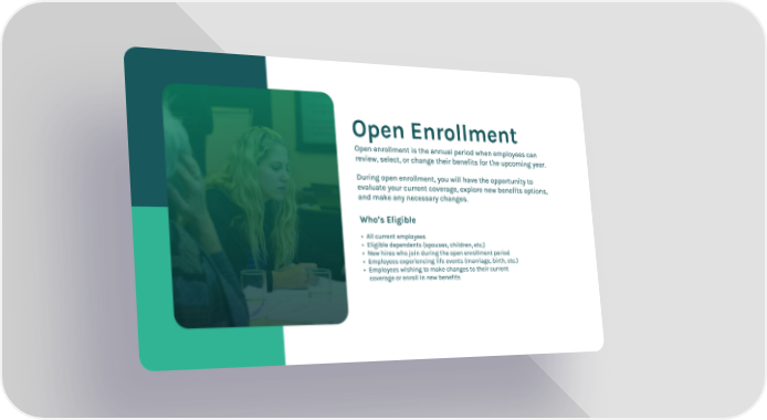 Open Enrollment Open enrollment is the annual period when employees can review, select, or change their benefits for the upcoming year. During open enrollment, you will have the opportunity to evaluate your current coverage, explore new benefits options, and make any necessary changes. Who’s Eligible • All current employees • Eligible dependents (spouses, children, etc.) • New hires who join during the open enrollment period • Employees experiencing life events (marriage, birth, etc.) • Employees wishing to make changes to their current coverage or enroll in new benefits