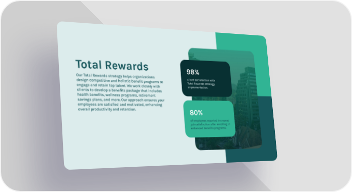 Total Rewards Our Total Rewards strategy helps organizations design competitive and holistic benefit programs to engage and retain top talent. We work closely with clients to develop a benefits package that includes health benefits, wellness programs, retirement savings plans, and more. Our approach ensures your employees are satisfied and motivated, enhancing overall productivity and retention. client satisfaction with Total Rewards strategy implementation. 98% of employees reported increased job satisfaction after enrolling in enhanced benefits programs. 80%