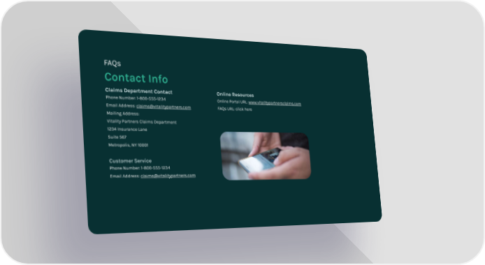 Contact Info FAQs Claims Department Contact Phone Number: 1-800-555-1234 Email Address: [email protected] Mailing Address: Vitality Partners Claims Department 1234 Insurance Lane Suite 567 Metropolis, NY 10001 Customer Service Phone Number: 1-800-555-1234 Email Address: [email protected] Online Resources Online Portal URL: www.vitalitypartnersclaims.com FAQs URL: click here