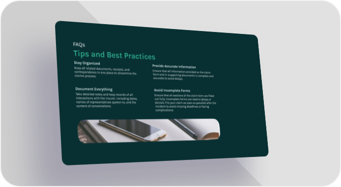 Tips and Best Practices FAQs Stay Organized Keep all related documents, receipts, and correspondence in one place to streamline the claims process. Provide Accurate Information Ensure that all information provided on the claim form and in supporting documents is complete and accurate to avoid delays. Document Everything Take detailed notes and keep records of all interactions with the insurer, including dates, names of representatives spoken to, and the content of conversations. Avoid Incomplete Forms Ensure that all sections of the claim form are filled out fully. Incomplete forms can lead to delays or denials. File your claim as soon as possible after the incident to avoid missing deadlines or facing complications.