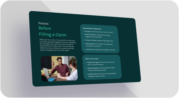 Before Filling a Claim Process Before you file a claim, it is essential to review your insurance policy thoroughly. Ensure you understand the coverage limits, exclusions, and any specific requirements for filing a claim. This will help you determine if your situation is covered under your policy and prepare you for the next steps. Documentation Preparation • Receipts: Proof of expenses or losses incurred. • Medical Records: If applicable, including diagnoses and treatments. • Photos or Videos: Evidence of damage or loss. • Police Reports: For incidents involving theft, vandalism, or accidents. • Claim Form: Completed and signed as required. When to file a claim • Property Damage: Due to events such as fire, theft, or natural disasters. • Medical Expenses: From accidents or health issues covered by your policy. • Liability Claims: When you are responsible for damage or injury to others.