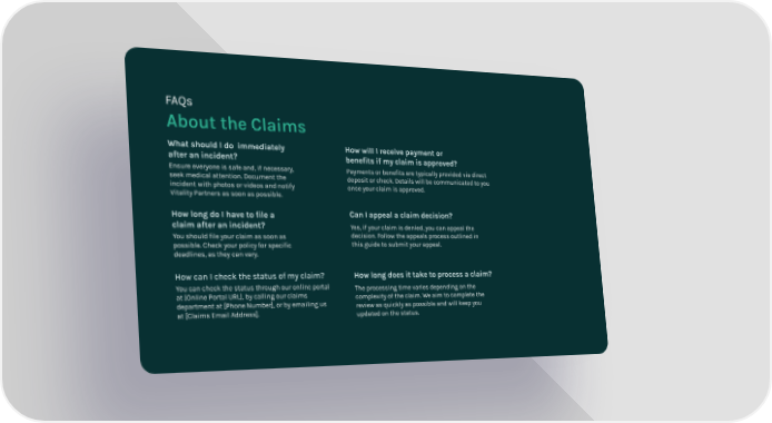 About the Claims FAQs What should I do immediately after an incident? Ensure everyone is safe and, if necessary, seek medical attention. Document the incident with photos or videos and notify Vitality Partners as soon as possible. How long do I have to file a claim after an incident? You should file your claim as soon as possible. Check your policy for specific deadlines, as they can vary. How can I check the status of my claim? You can check the status through our online portal at [Online Portal URL], by calling our claims department at [Phone Number], or by emailing us at [Claims Email Address]. How will I receive payment or benefits if my claim is approved? Payments or benefits are typically provided via direct deposit or check. Details will be communicated to you once your claim is approved. Can I appeal a claim decision? Yes, if your claim is denied, you can appeal the decision. Follow the appeals process outlined in this guide to submit your appeal. How long does it take to process a claim? The processing time varies depending on the complexity of the claim. We aim to complete the review as quickly as possible and will keep you updated on the status.