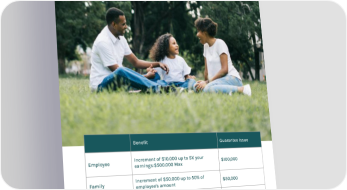 Employee Benefits Overview Page 12 Page 1413 Benefit Guarantee Issue Employee Increment of $10.000 up to 5X your earnings:$500.000 Max $100,000 Family Increment of $50.000 up to 50% of employee's amount $50,000 Child $10,000 $10,000