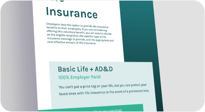 6. Life Insurance Employers have the option to provide life insurance benefits to their employees. If you are considering offering this voluntary benefit, you will need to decide on the eligible recipients, the specific type of life insurance coverage to provide, and the appropriate and cost-effective amount of life insurance. 10 Basic Life + AD&D 100% Employer Paid! You can't put a price tag on your life, but you can protect your loved ones with life insurance in the event of a premature loss. Basic Life benefit: 1x your earnings to a max of $100,000