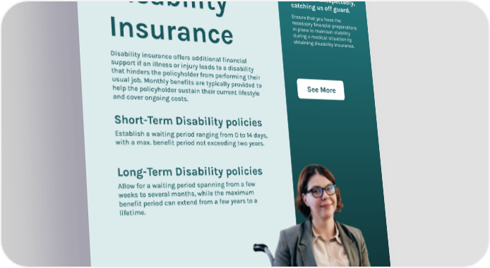 8. Disability Insurance Disability insurance offers additional financial support if an illness or injury leads to a disability that hinders the policyholder from performing their usual job. Monthly benefits are typically provided to help the policyholder sustain their current lifestyle and cover ongoing costs. 14 Establish a waiting period ranging from 0 to 14 days, with a max. benefit period not exceeding two years. Short-Term Disability policies Allow for a waiting period spanning from a few weeks to several months, while the maximum benefit period can extend from a few years to a lifetime. Long-Term Disability policies Diseases and injuries can occur unexpectedly, catching us off guard. Ensure that you have the necessary financial preparations in place to maintain stability during a medical situation by obtaining disability insurance. See More