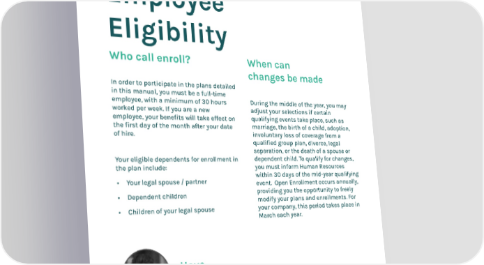 3. Employee Eligibility During the middle of the year, you may adjust your selections if certain qualifying events take place, such as marriage, the birth of a child, adoption, involuntary loss of coverage from a qualified group plan, divorce, legal separation, or the death of a spouse or dependent child. To qualify for changes, you must inform Human Resources within 30 days of the mid-year qualifying event. Open Enrollment occurs annually, providing you the opportunity to freely modify your plans and enrollments. For your company, this period takes place in March each year. In order to participate in the plans detailed in this manual, you must be a full-time employee, with a minimum of 30 hours worked per week. If you are a new employee, your benefits will take effect on the first day of the month after your date of hire. Your eligible dependents for enrollment in the plan include: • Your legal spouse / partner • Dependent children • Children of your legal spouse 4 Who call enroll? Have Questions? When can changes be made 5