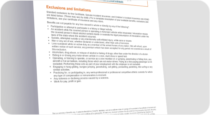 Ready to Enroll? Enrollment instructions will be provided by your employer. If you have additional questions before you enroll, please call: Voya Employee Benefits Customer Service at (877) 236-7564 or go to https://presents.voya.com/EBRC/UnityPointHealth Exclusions and limitations Standard exclusions for the Certificate, Spouse Accident Insurance, and Children’s Accident Insurance and AD&D are listed below. (These may vary by state.) For a complete description of your available benefits, exclusions and limitations, see your certificate of insurance and any riders. Benefits are not payable for any loss caused in whole or directly by any of the following*: Participation or attempt to participate in a felony or illegal activity. An accident while the covered person is operating a motorized vehicle while intoxicated. Intoxication means the covered person’s blood alcohol content meets or exceeds the legal presumption of intoxication under the laws of the state where the accident occurred. Suicide, attempted suicide or any intentionally self-inflicted injury, while sane or insane. War or any act of war, whether declared or undeclared, other than acts of terrorism. Loss sustained while on active duty as a member of the armed forces of any nation. We will refund, upon written notice of such service, any premium which has been accepted for any period not covered as a result of this exclusion. Alcoholism, drug abuse, or misuse of alcohol or taking of drugs, other than under the direction of a doctor. Riding in or driving any motor-driven vehicle in a race, stunt show or speed test. Operating, or training to operate, or service as a crew member of, or jumping, parachuting or falling from, any aircraft or hot air balloon, including those which are not motor-driven. Flying as a fare-paying passenger is not excluded. Performing these acts as part of your employment with the employer is not excluded. Engaging in hang-gliding, bungee jumping, parachuting, sail gliding, parasailing, parakiting, kite surfing or any similar activities. Practicing for, or participating in, any semi-professional or professional competitive athletic contests for which any type of compensation or remuneration is received. Any sickness or declining process caused by a sickness. Work for pay, profit or gain. This is a summary of benefits only. A complete description of benefits, limitations, exclusions and termination of coverage will be provided in the certificate of insurance and riders. All coverage is subject to the terms and conditions of the group policy. If there is any discrepancy between this document and the group policy documents, the policy documents will govern. To keep coverage in force, premiums are payable up to the date of coverage termination. Accident Insurance is underwritten by ReliaStar Life Insurance Company (Minneapolis, MN), a member of the Voya® family of companies. Policy Form #RL-ACC3-POL-16; Certificate Form #RL-ACC3-CERT-16; and Rider Forms: Spouse Accident Rider Form #RL-ACC3-SPR-16, Children's Accident Rider Form #RL-ACC3-CHR-16, Wellness Benefit Rider Form #RL-ACC3-WELL-16, Accidental Death & Dismemberment (AD&D) Rider Form #RL-ACC3-ADR-16. Form numbers, provisions and availability may vary by state and employer’s plan. 1222304 ACC2 Only Date Prepared 08/24/2023 212309-08152020