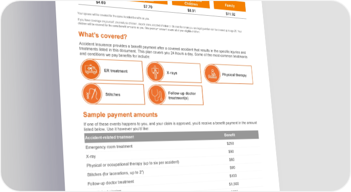 How much does it cost? This table shows your rates for Accident Insurance. The cost provided below includes Accident Insurance premium and a fee for Voya Travel Assistance. Bi-Weekly Rates (26 Pay Periods) Employee Employee and Employee and Family Spouse Children $4.69 $7.70 $8.91 $11.92 Your spouse will be covered for the same Accident benefits as you. If you have coverage on yourself, your natural children, stepchildren, adopted children or children for whom you are legal guardian can be covered up to age 26. Your children will be covered for the same benefit amounts as you. One premium amount covers all of your eligible children. What’s covered? Accident Insurance provides a benefit payment after a covered accident that results in the specific injuries and treatments listed in this document. This plan covers you 24 hours a day. Some of the most common treatments and conditions we pay benefits for include: ER treatment X-rays Physical therapy Stitches Follow-up doctor treatment(s) Sample payment amounts If one of these events happens to you, and your claim is approved, you’d receive a benefit payment in the amount listed below. Use it however you’d like: Accident-related treatment Benefit Emergency room treatment $250 X-ray $90 Physical or occupational therapy (up to six per accident) $60 Stitches (for lacerations, up to 2”) $90 Follow-up doctor treatment $100 Hospital admission $1,500 Hospital confinement (per day, up to 365 days) $375 This is only a small preview of the benefits available to you. See the full Schedule of Benefits toward the end of this document.
