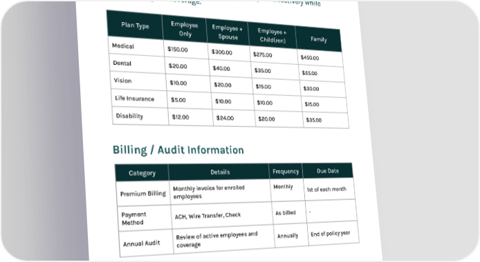Premium Summary Understanding your benefits cost is essential to making the best decision for you and your family. Below is a breakdown of the premium costs for each coverage option, helping you plan effectively while maximizing your coverage. Plan Type Employee Only Employee + Spouse Employee + Child(ren) Family Medical $150.00 $300.00 $275.00 $450.00 Dental $20.00 $40.00 $35.00 $55.00 Vision $10.00 $20.00 $15.00 $30.00 Life Insurance $5.00 $10.00 $10.00 $15.00 Disability $12.00 $24.00 $20.00 $35.00 Billing / Audit Information Conditions / Subjectivities Coverage is subject to eligibility requirements, timely premium payments, and adherence to the terms outlined in the policy. Category Details Frequency Due Date Premium Billing Monthly invoice for enrolled employees Monthly 1st of each month Payment Method ACH, Wire Transfer, Check As billed - Annual Audit Review of active employees and coverage Annually End of policy year 4
