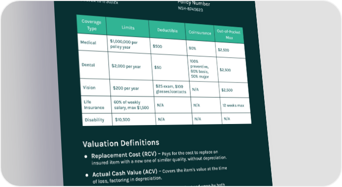 Property Named Insurance NovaShield Health Policy Dates 04/30/2x to 1/30/2x Carrier / A.M. Best Ratings Sentinel Insurance Policy Number NSH-8745623 Coverage Type Limits Deductible Coinsurance Out-of-Pocket Max Medical $1,000,000 per policy year $500 80% $2,500 Dental $2,000 per year $50 100% preventive, 80% basic, 50% major $2,500 Vision $200 per year $25 exam, $100 glasses/contacts N/A $2,500 Life Insurance 60% of weekly salary, max $1,500 N/A N/A 12 weeks max Disability $10,500 N/A N/A N/A Valuation Definitions ● Replacement Cost (RCV) – Pays for the cost to replace an insured item with a new one of similar quality, without depreciation. ● Actual Cash Value (ACV) – Covers the item's value at the time of loss, factoring in depreciation. ● Agreed Value – A pre-determined amount agreed upon by both insurer and insured, avoiding depreciation calculations. ● Market Value – The price an asset would fetch in the open market, which can be different from replacement cost. ● Functional Replacement Cost – Covers replacing an item with one of equivalent function rather than identical materials. 5