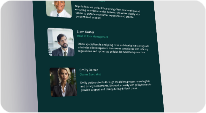 7 Service Teams Sophia Reynolds Director of Client Services Sophia focuses on building strong client relationships and ensuring seamless service delivery. She works closely with teams to enhance customer experience and provide personalized support. Liam Carter Head of Risk Management Ethan specializes in analyzing risks and developing strategies to minimize client exposure. He ensures compliance with industry regulations and optimizes policies for maximum protection. Emily Carter Claims Specialist Emily guides clients through the claims process, ensuring fair and timely settlements. She works closely with policyholders to provide support and clarity during difficult times.