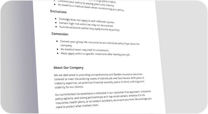 Important Details Portability ● Keep your coverage even if you change jobs or retire. ● Continue your policy by paying premiums directly. ● No need for a medical exam when transitioning your policy. Exclusions ● Coverage does not apply to self-inflicted injuries. ● Certain high-risk activities may not be covered. ● Suicide exclusion period may apply (varies by policy). Conversion ● Convert your group life insurance to an individual policy if you leave the company. ● No medical exam required for conversion. ● Must apply within a specific timeframe after leaving your job. About Our Company We are dedicated to providing comprehensive and flexible insurance solutions tailored to meet the evolving needs of individuals and businesses. With years of industry expertise, we prioritize financial security, peace of mind, and long-term stability for our clients. Our commitment to excellence is reflected in our customer-first approach, innovative policy options, and strong partnerships with top-rated carriers. Whether it’s life insurance, health plans, or retirement solutions, we ensure you have the coverage you need to protect what matters most. 1234 Crestview Lane, Suite 500 Brookhaven, NY 11590 Phone: (555) 987-6543 Email: [email protected]