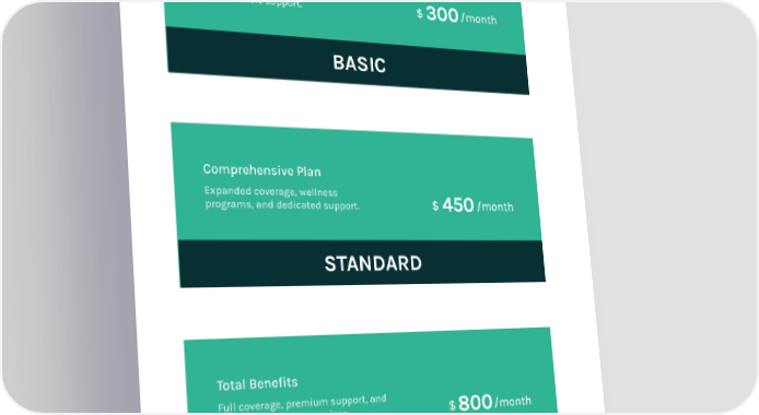 Essential Care Core health coverage, preventive care, and basic support. BASIC 300 $ /month Comprehensive Plan Expanded coverage, wellness programs, and dedicated support. STANDARD 450 $ /month Total Benefits Full coverage, premium support, and advanced wellness services. PREMIUM 800 $ /month 9