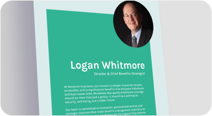 Logan Whitmore Director & Chief Benefits Strategist At NovaLink Insurance, our mission is simple: to provide reliable, accessible, and comprehensive benefits that empower individuals and businesses alike. We believe that quality healthcare coverage should be more than just a policy—it should be a pathway to security, well-being, and a better future. Our team is committed to innovation, personalized service, and strategic solutions that make benefits management seamless for employers while ensuring employees get the support they deserve. We take pride in our ability to navigate the complexities of the industry, staying ahead of regulatory changes and market trends to deliver the best possible coverage options. At NovaLink, we don’t just offer insurance—we offer peace of mind. Director’s Statement 4