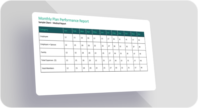 Monthly Plan Performance Report Sample Client – Medical Report Category Jan Feb Mar Apr May Jun Jul Aug Sep Oct Nov Dec Employee 12 15 18 20 22 25 27 30 32 35 37 40 Employee + Spouse 12 15 18 20 22 25 27 30 32 35 37 40 Family 12 15 18 20 22 25 27 30 32 35 37 40 Total Expenses ($) 12 15 18 20 22 25 27 30 32 35 37 40 Total Members 12 15 18 20 22 25 27 30 32 35 37 40