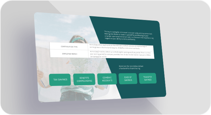 The key to saving for retirement is to start early and stay committed. Making the choice to invest in yourself by contributing to your employer sponsored retirement plan is a decision that may have a big impact on your ability to retire confidently. CONTRIBUTION TYPE Acme Corp offers traditional pre-tax deferrals and Roth deferrals on a percentage of earnings basis into the Acme Corp,Inc. 401(k)Plan With American Funds. EMPLOYER MATCH Acme Corp} matches 50%of up to 5%of eligible earnings each pay period. There is a three year vesting period for company contributions. To Get the full match: if you put in 5%the company puts in 2.5% TAX SAVINGS BENEFITS COMPOUNDING COMBINE ACCOUNTS EASE OF SAVINGS TRANSFER SAVINGS Hover over the icons below to learn a few benefits of contributing