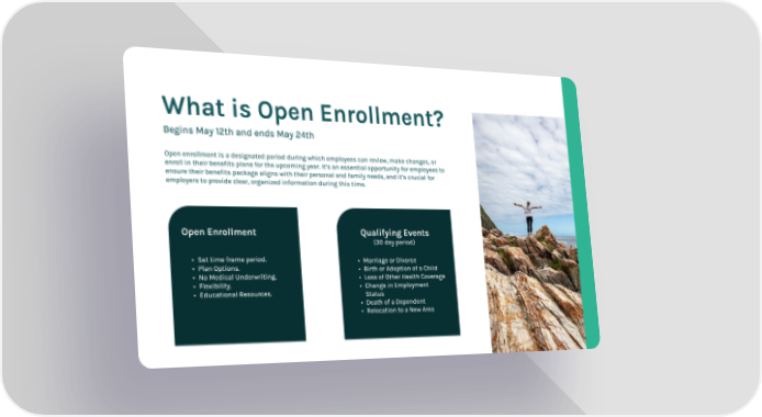 What is Open Enrollment? Begins May 12th and ends May 24th Open enrollment is a designated period during which employees can review, make changes, or enroll in their benefits plans for the upcoming year. It’s an essential opportunity for employees to ensure their benefits package aligns with their personal and family needs, and it’s crucial for employers to provide clear, organized information during this time. Open Enrollment • Set time frame period. • Plan Options. • No Medical Underwriting. • Flexibility. • Educational Resources. Qualifying Events • Marriage or Divorce • Birth or Adoption of a Child • Loss of Other Health Coverage • Change in Employment Status • Death of a Dependent • Relocation to a New Area (30 day period)