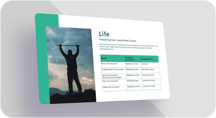 Life Protecting Your Loved Ones' Future Our life insurance plan provides financial protection for your beneficiaries in the event of your death, ensuring they have the necessary support during a challenging time. Benefit Employee Contribution Coverage Options Basic Life Insurance $2050 per month Individual Supplemental Life Insurance $1000 per month Individual, Family Accidental Death & Dismemberment (AD&D $2000 per month Individual, Family Term Life Insurance $5,000 per year Individual, Family Whole Life Insurance $4000 per month Individual, Family