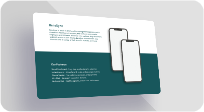 BeneSync BeneSync is an all-in-one benefits management app designed to streamline healthcare, insurance, and wellness programs for employees and HR teams. With real-time updates, easy enrollment, and 24/7 access to plan details, BeneSync ensures users stay informed and in control of their benefits anytime, anywhere. Group Life and AD&D Smart Enrollment – Easy step-by-step benefits selection. Instant Access – View plans, ID cards, and coverage anytime. Claims Tracker – Track claims, approvals, and payments. Live Chat – Get expert support on demand. Wellness Hub – Health programs, virtual care, and rewards. Key Features: