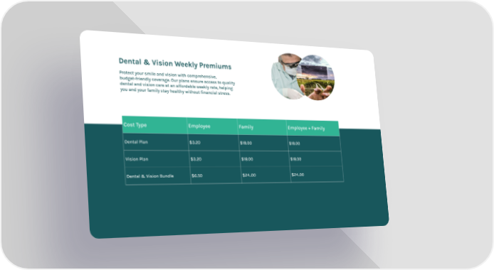 Dental & Vision Weekly Premiums Protect your smile and vision with comprehensive, budget-friendly coverage. Our plans ensure access to quality dental and vision care at an affordable weekly rate, helping you and your family stay healthy without financial stress. Cost Type Employee Family Employee + Family Dental Plan $3.20 $18.00 $18.00 Vision Plan $3.20 $18.00 $18.00 Dental & Vision Bundle $6.50 $24..00 $24..00
