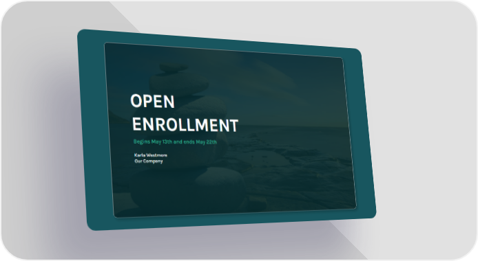 This document announces the open enrollment period from May 13th to May 22nd, presented by Karla Westmore of 'Our Company.'