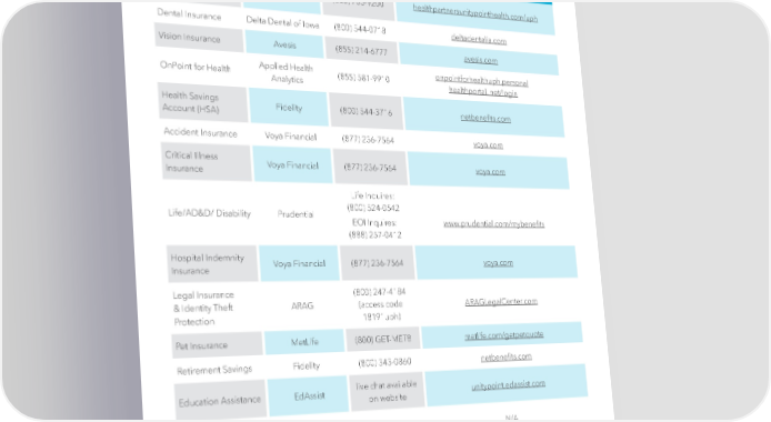 Vendor Contact List PLAN CONTACT PHONE WEBSITE Health Insurance/ HealthPartners (888) 735-9200 healthpartnersunitypointhealth.com/uph FSA Dental Insurance Delta Dental of Iowa (800) 544-0718 deltadentalia.com Vision Insurance Avesis (855) 214-6777 avesis.com OnPoint for Health Applied Health (855) 581-9910 onpointforhealthuph.personal Analytics healthportal. net/login Health Savings Fidelity (800) 544-3716 netbene昀椀ts.com Account (HSA) Accident Insurance Voya Financial (877) 236-7564 voya.com Critical Illness Voya Financial (877) 236-7564 voya.com Insurance Life Inquires: Life/AD&D/ Disability Prudential (800) 524-0542 EOI Inquires: www.prudential.com/mybene昀椀ts (888) 257-0412 Hospital Indemnity Voya Financial (877) 236-7564 voya.com Insurance Legal Insurance (800) 247-4184 & Identity Theft ARAG (access code ARAGLegalCenter.com Protection 18191uph) Pet Insurance MetLife (800) GET-MET8 metlife.com/getpetquote Retirement Savings Fidelity (800) 343-0860 netbene昀椀ts.com Education Assistance EdAssist live chat available unitypoint.edassist.com on website UnityPoint Health IT UnityPoint Health (800) 681-2060 N/A Service Center | 48 |