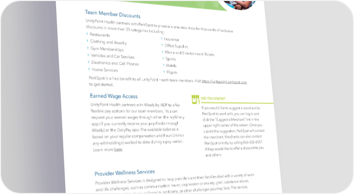 Team Member Discounts Team Member Discounts UnityPoint Health partners with PerkSpot to provide a one-stop shop for thousands of exclusive discounts in more than 25 categories including: › › Restaurants Insurance › › Clothing and Jewelry Of昀椀ce Supplies › › Gym Memberships Movie and Enter tainment Tickets › › V ehicles and Car Services Sports › › Electr onics and Cell Phones Hotels › › Home Services Flights PerkSpot is a free bene昀椀t to all UnityPoint Health team members. Visit https://unitypoint.perkspot.com to get started. Earned Wage Access DID YOU KNOW? UnityPoint Health partners with Wisely by ADP to offer If you would like to suggest a merchant for 昀氀exible pay options for our team members. You can PerkSpot to work with, you can log in and request your earned wages through either the myWisely click the “Suggest a Merchant” link in the app (if you currently receive your paychecks through upper right corner of the screen. Once you Wisely) or the DailyPay app. The available balance is submit the suggestion, PerkSpot will contact based on your regular compensation and hours (minus the merchant. Merchants can also contact any withholdings) worked to date during a pay period. PerkSpot directly by calling 866-606-6057 Learn more here. if they would like to offer a discount to you and others. Provider Wellness Services Provider Wellness Services is designed to help providers and their families deal with a variety of work and life challenges, such as communication issues, depression or anxiety, grief, substance abuse, relationship troubles, legal or 昀椀nancial problems, or other challenges you may face. The service, administered by Vital Work-Life, provides the following bene昀椀ts: › › › Counseling Virtual Concierge Services Financial Services › › › Provider Peer Coaching Legal Services Web Services Please call Provider Wellness Services at (877) 731-3949 to utilize this EAP service or go to vitalforphysicians.com. Username: unitypointclinic | Password: provider | 39 |