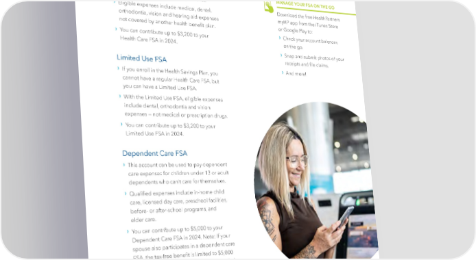 Flexible Spending Accounts (FSA), continued Health Care FSA › T his account is for eligible health care MANAGE YOUR FSA ON THE GO expenses for you and your dependents. › Download the free HealthPartners Eligible e xpenses include medical, dental, orthodontia, vision and hearing aid expenses myHP app from the iTunes Store not covered by another health bene昀椀t plan. or Google Play to: › › Check your account balances Y ou can contribute up to $3,200 to your on the go. Health Care FSA in 2024. › Snap and submit photos of your Limited Use FSA receipts and 昀椀le claims. › › And more! If you enroll in the Health Savings Plan, you cannot have a regular Health Care FSA, but you can have a Limited Use FSA. › With the Limited Use FSA, eligible expenses include dental, orthodontia and vision expenses — not medical or prescription drugs. › Y ou can contribute up to $3,200 to your Limited Use FSA in 2024. Dependent Care FSA › T his account can be used to pay dependent care expenses for children under 13 or adult dependents who can’t care for themselves. › Quali昀椀ed e xpenses include in-home child care, licensed day care, preschool facilities, before- or after-school programs, and elder care. › Y ou can contribute up to $5,000 to your Dependent Care FSA in 2024. Note: If your spouse also participates in a dependent care FSA, the tax-free bene昀椀t is limited to $5,000 for both of you combined. If you are married but 昀椀ling taxes separately, the tax-free bene昀椀t is limited to $2,500. | 20 |