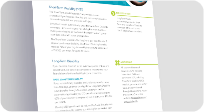 Short-Term Disability & Long-Term Disability Short-Term Disability (STD) NO COST TO YOU The Short-Term Disability (STD) Plan provides income UnityPoint Health protection if you become disabled and cannot work due to a automatically provides Short- non-work-related illness or accidental injury. Term and Long-Term Disability UnityPoint Health automatically provides Short-Term Disability coverage- at no cost to you- coverage – at no cost to you – for all eligible team members. for all eligible team members. Participation begins on the 昀椀rst of the month following your start date or bene昀椀t status change date. The Short-Term Disability Plan begins to pay bene昀椀ts after 7 days of continuous disability. Short-Term Disability bene昀椀ts replace 70% of your regular weekly base pay, to a maximum of $3,500 per week, for up to 26 weeks. Long-Term Disability ABSENCEONE If you become disabled for an extended period of time and All approved Leaves of cannot work, no bene昀椀t becomes more important to your Absence (LOA), including 昀椀nancial security than disability income protection. intermittent FMLA and BASIC LONG-TERM DISABILITY continuous LOA, including If you remain totally disabled and unable to work for more Short-Term Disability (STD), than 180 days, you may be eligible for Long-Term Disability medical, personal, and military (LTD) bene昀椀ts through Prudential. UnityPoint Health leave, are administered automatically provides you LTD bene昀椀ts that replace up to through AbsenceOne. Access 60% of your monthly base pay, up to a maximum of $15,000 the AbsenceOne online per month. portal at AbsenceOne.com/ Monthly LTD bene昀椀ts will be reduced by Social Security and unitypointhealth. any other disability income you are eligible to receive, such as Workers’ Compensation. INDIVIDUAL DISABILITY INCOME UnityPoint Health recognizes that basic Long-Term Disability (LTD) insurance alone may not provide enough of a monthly income to meet your 昀椀nancial obligations. That’s why we offer supplemental coverage that guarantees a disability bene昀椀t amount of up to $10,000 per month on top of your basic LTD bene昀椀t amount, with no medical exams required. | 31 |