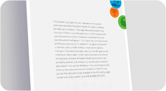 This booklet highlights the main features of the bene昀椀t plans sponsored by UnityPoint Health. Full details of these bene昀椀ts are contained in the legal documents governing the plans. If there is any discrepancy or con昀氀ict between the plan documents and the information presented here, the plan documents will govern. In all cases, the plan documents are the exclusive source for determining rights and bene昀椀ts under the plans. UnityPoint Health reserves the right to change or discontinue the plans at any time with appropriate noti昀椀cation. Participation in the plans does not constitute an employment contract. UnityPoint Health reserves the right to modify, amend, or terminate any bene昀椀t plan or practice described in this booklet. Nothing in this booklet guarantees that any new plan provisions will continue in effect for any period. Plan documents are available at the HR landing page on the Hub or by contacting AskHR at (888) 543-2275. | 44 |