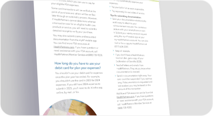 Flexible Spending Accounts (FSA), continued Your FSA Debit Card FSA TIPS & RESOURCES When you enroll in the health care or limited Tips to help automatically approve your use FSA, you will receive a debit card from expenses: HealthPartners, which you can use to pay for › your eligible FSA expenses. P ay your bill in full as soon as possible. › Some card transactions will be veri昀椀ed at the P ay separately for each date of service. point of purchase and others will be veri昀椀ed Tips for submitting documentation: › later through an automatic process. However, Save your documenta tion electronically if HealthPartners cannot determine whether so it’s easy to attach to your a transaction was for an eligible health care reimbursement request. You can take a product or service, you will need to submit a picture with your smartphone or scan detailed receipt to verify your purchase. it. Submit your reimbursement request You may also submit claims and requested using the myHP mobile app or your documentation from the myHP mobile app. myHealthPartners account. You can also You can 昀椀nd more FSA resources at mail or fax a copy to HealthPartners at HealthPartners.com. If you have questions or (877) 624-2287. › need assistance with your FSA account, call K eep all receipts. › HealthPartners Member Services at (888) 735-9200. If you don’t have a HealthPartners medical plan, get a copy of your How long do you have to use your Explanation of Bene昀椀ts (EOB). › R ead all letters and emails from debit card for plan year expenses? HealthPartners. They let you know when You shouldn’t use your debit card for expenses documentation is needed. › once the plan year has ended. For example, Send in documenta tion right away. Your you shouldn’t use the card in 2025 for 2024 card could be suspended if you wait too expenses. If you still have 2024 expenses to long. If documentation is requested and submit in 2025, you’ll need to do it in the app, not received you may be taxed on the online, by mail, or fax. amount of the transaction. Additional FSA resources can be found at HealthPartners.com. If you have questions or need assistance with your FSA account, call HealthPartners Member Services at (888) 735-9200. | 21 |