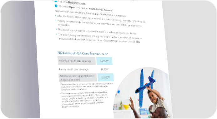 Health Savings Account (HSA), continued HSA Account Transfer Process To transfer an HSA account from another provider, team members must 昀椀rst set up their Fidelity HSA: Log in to NetBene昀椀ts.com. 1 Click the “Open” link next to “Health Savings Account.” 2 Follow the online instructions. Establishing a Fidelity HSA is not automatic. › Af ter the Fidelity HSA is open, team members may transfer savings from other HSA providers. › F idelity can coordinate the transfer for team members and does not charge a fee for this transaction. › T his transfer is not considered a taxable event and will not be reported to the IRS. › T he assets being transferred are not applied toward the team member’s HSA maximum annual contributions limit. To transfer other HSA assets team members can click here. 2024 Annual HSA Contribution Limits* Individual health care coverage $4,150** Family health care coverage $8,300** Additional catch-up contribution $1,000** (if age 55 or older) * Please remember to not exceed the annual IRS HSA contribution limit, which is the total of your personal contribution plus UnityPoint Health contribution. **T he maximum amount you may contribute to your HSA, assuming you enroll at the start of 2024. These amounts include UnityPoint Health contributions. If you enroll into an HSA after the 昀椀rst of the year, this amount will change based on the monthly prorated UnityPoint Health contribution. | 14 |