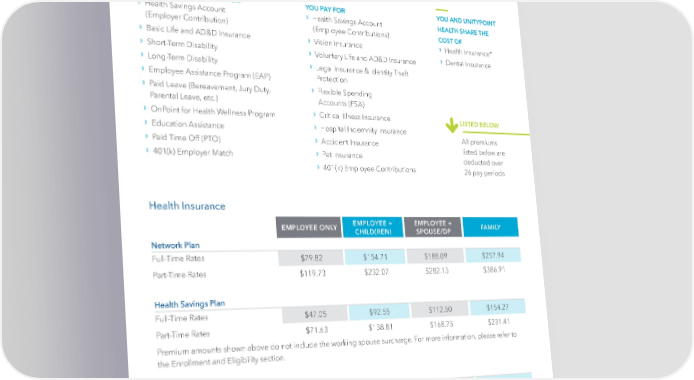 Cost Breakdown You and UnityPoint Health (UPH) share the cost of your bene昀椀ts. You pay your share of most bene昀椀t costs before federal, state and Social Security taxes are calculated. UNITYPOINT HEALTH PAYS FOR YOU PAY FOR YOU AND UNITYPOINT › Health Savings Account › HEALTH SHARE THE Health Savings Account (Employer Contribution) (Employee Contributions) COST OF › › Basic Life and AD&D Insurance › Health Insurance* Vision Insurance › › Short-Term Disability › Dental Insurance Voluntary Life and AD&D Insurance › Long-Term Disability › Legal Insurance & Identity Theft › Protection Employee Assistance Program (EAP) › › Flexible Spending Paid Leave (Bereavement, Jury Duty, Parental Leave, etc.) Accounts (FSA) › › Critical Illness Insurance OnPoint for Health Wellness Program LISTED BELOW › › Hospital Indemnity Insurance Education Assistance All premiums › › Accident Insurance Paid Time Off (PTO) listed below are › › Pet Insurance 401(k) Employer Match deducted over › 401(k) Employee Contributions 26 pay periods Health Insurance EMPLOYEE ONLY EMPLOYEE + EMPLOYEE + FAMILY CHILD(REN) SPOUSE/DP Network Plan Full-Time Rates $79.82 $154.71 $188.09 $257.94 Part-Time Rates $119.73 $232.07 $282.13 $386.91 Health Savings Plan Full-Time Rates $47.05 $92.55 $112.50 $154.27 Part-Time Rates $71.63 $138.81 $168.75 $231.41 Premium amounts shown above do not include the working spouse surcharge. For more information, please refer to the Enrollment and Eligibility section. Dental Insurance Basic Plan – Full & Part Time Rates $5.89 $13.20 $11.58 $17.50 Premier Plan – Full & Part Time Rates $9.54 $21.63 $19.05 $28.85 Vision Insurance Full & Part Time Rates $3.29 $7.16 $6.32 $9.38 *UnityPoint Health pays for the majority of these costs | 46 |