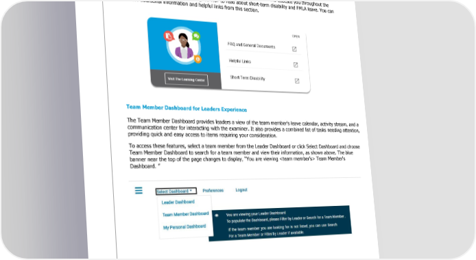 for Disability and Leave of Absence Claims Learning Center The Learning Center is a document library offering information to assist and educate you throughout the claim process. Click Visit The Learning Center to read about short-term disability and FMLA leave. You can also access additional information and helpful links from this section. Team Member Dashboard for Leaders Experience The Team Member Dashboard provides leaders a view of the team member's leave calendar, activity stream, and a communication center for interacting with the examiner. It also provides a combined list of tasks needing attention, providing quick and easy access to items requiring your consideration. To access these features, select a team member from the Leader Dashboard or click Select Dashboard and choose Team Member Dashboard to search for a team member and view their information, as shown above. The blue banner near the top of the page changes to display, “You are viewing Team Member's Dashboard. ” Sedgwick Copyright © 2019 The information contained herein is confidential and proprietary to Sedgwick. Last Updated March 21, 2019 -6-